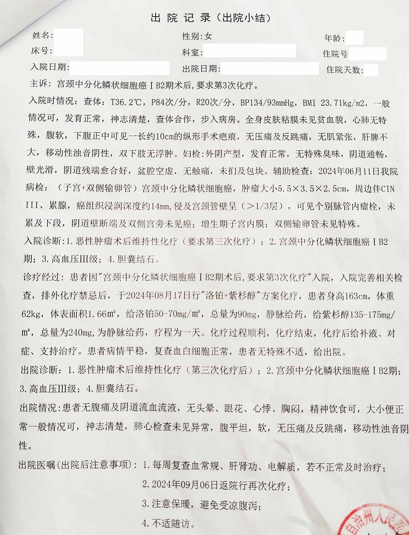 资助情况:此妇女为宫颈中分化鳞状细胞癌IB2期,HPV16阳性病人。病较轻,是两癌筛查受益者,已于2025-7-8救助2500元。