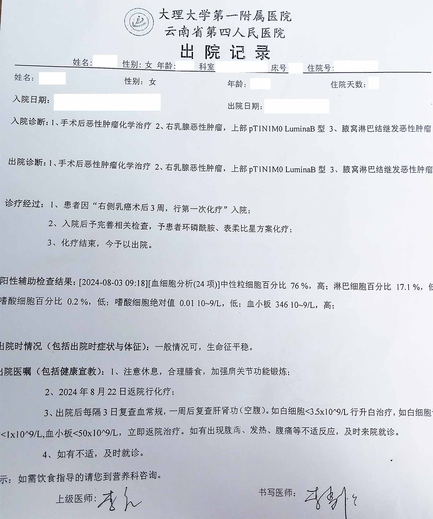 术后化疗5次,因身体不支,没有继续做,改用内分泌治疗:阿那+戈舍瑞林,2024-12治疗结束,没有做放疗。