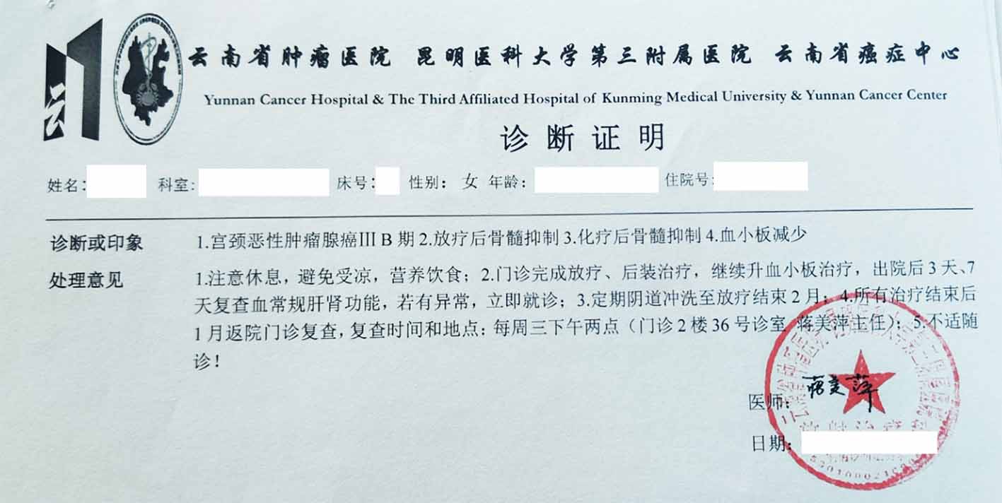 资助情况:此妇女为宫颈腺癌IIIB期病人。病较重,治疗未结束,享有个人低保,已于2025-7-8救助3500元。