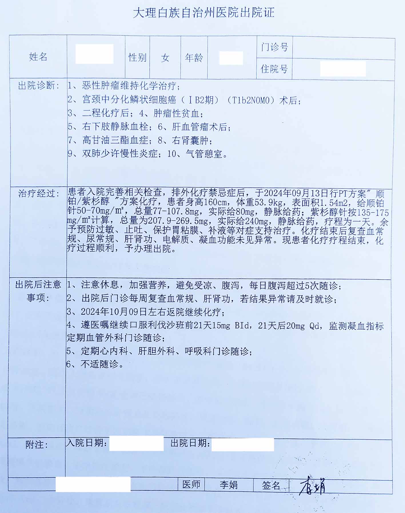 宫颈中分化鳞状细胞癌(T1b2N0M0,IB2期),HPV58型阳性。因绝经后阴道流血3次,2024-6在县妇幼做活检时大流血,于2024-7-10到大理附属医院活检提示高级别鳞状上皮内瘤变间质浸润,HPV58型阳性,2024-7-19行“广泛性子宫切除术”,术后病理显示,宫颈浸润性鳞状细胞癌(约15mm),中分化,未见淋巴结转移。术后6次化疗,因身体不适未做放疗。现定期复查。