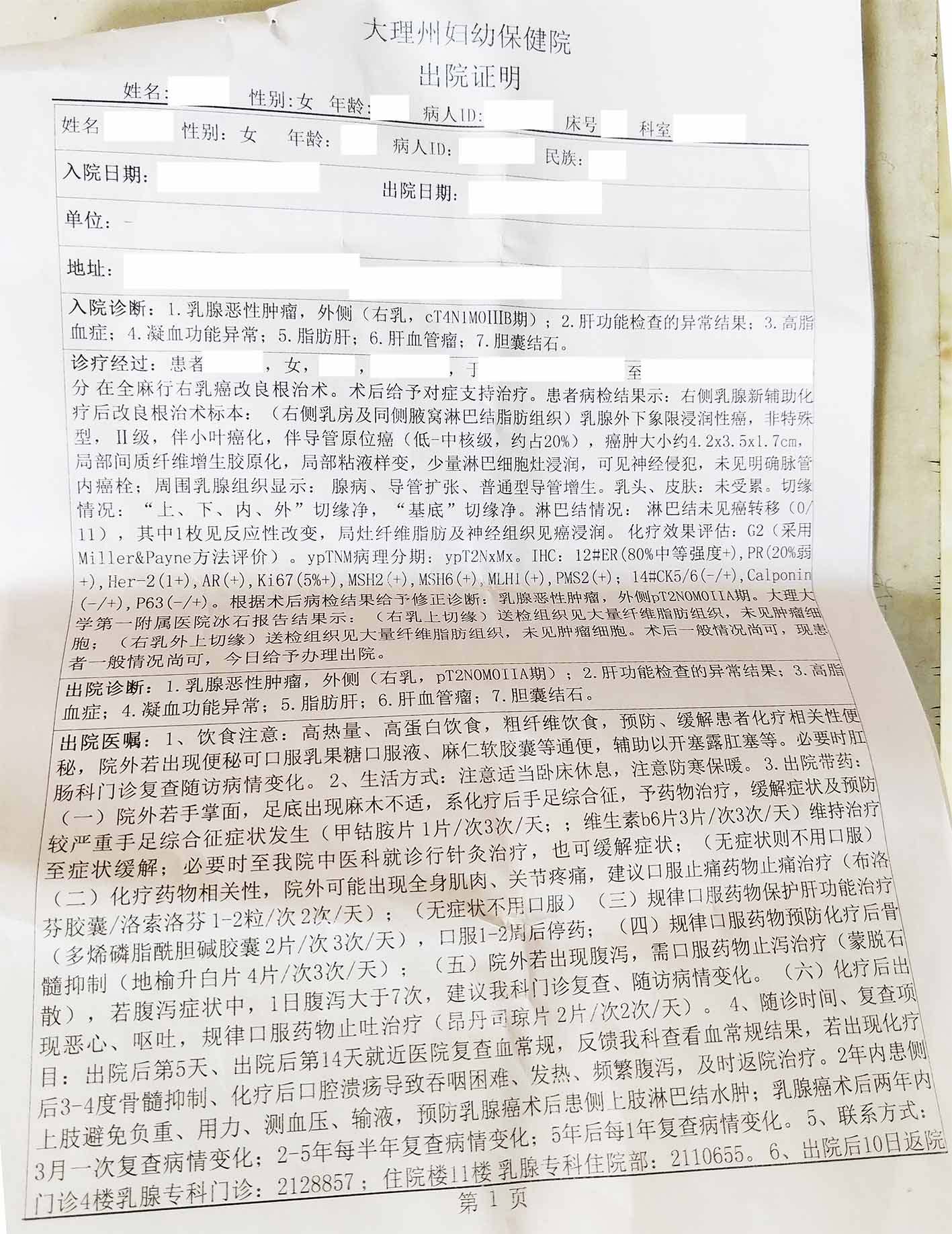 资助情况:此妇女为右乳浸润性癌(术前cT4N1M0,IIIB期,术后pT2N0M0,IIA期)病人。病较重,仍在治疗中,治疗效果好,是两癌筛查受益者,已于2025-7-8救助3500元。